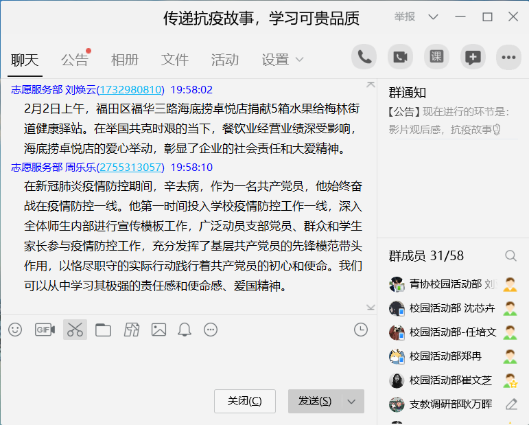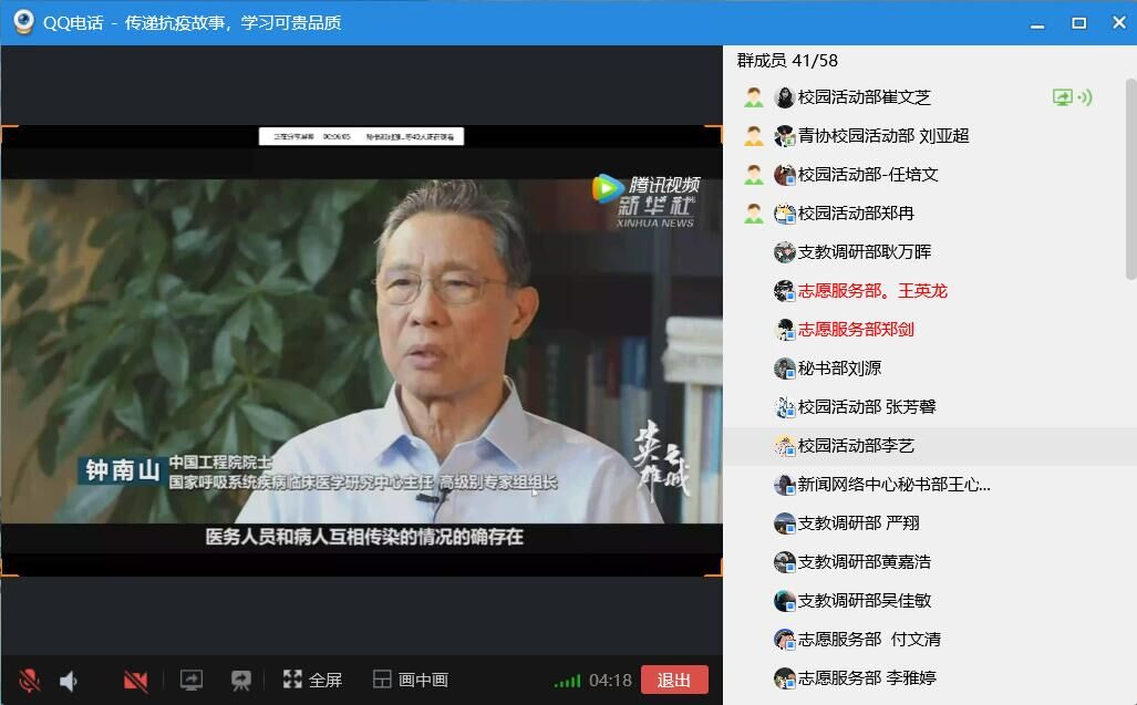 在抗击新型冠状病毒肺炎这场无声的战役之中,涌现出一大批勇毅的英雄,他们主动出击,甘当疫情防控“守门员”。为了深入了解抗疫英雄们的感人事迹,从中学习他们冲锋在前,不惧艰险的精神,开云kaiyun登录入口心连心爱心社于4月5日晚在线上举办了传递“抗疫故事,学习可贵品质”主题活动,心连心爱心社部分成员参加了本次活动。