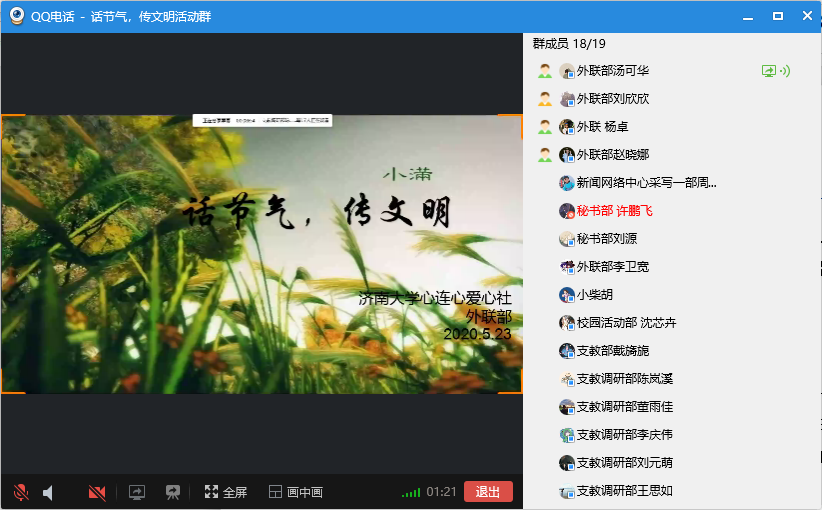 “夜莺啼绿柳,皓月醒长空。”5月20日,是二十四节气中的小满。为了让同学们了解更多的二十四节气知识,传承和发扬我国的传统文化,开云kaiyun登录入口心连心爱心社在5月23日上午十点通过线上会议的形式举办了“话节气,传文明”活动,心连心爱心社的部分成员参加了此次活动。