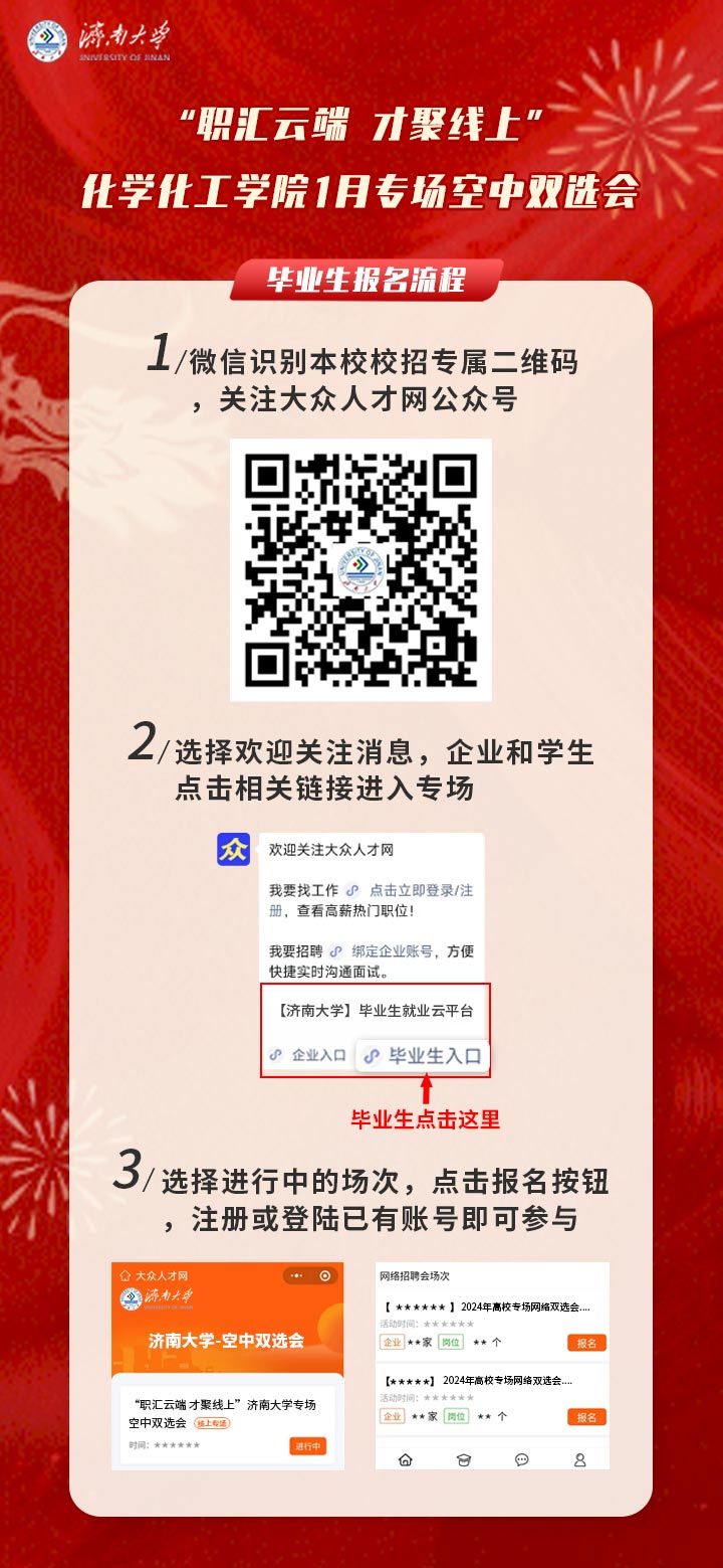 手机微信扫码关注“大众人才网”微信公众号,企业和毕业生分别点击相关按钮进入开云kaiyun登录入口校招端口,点击本学院报名按钮,注册或登录已有账号即可直接参与。